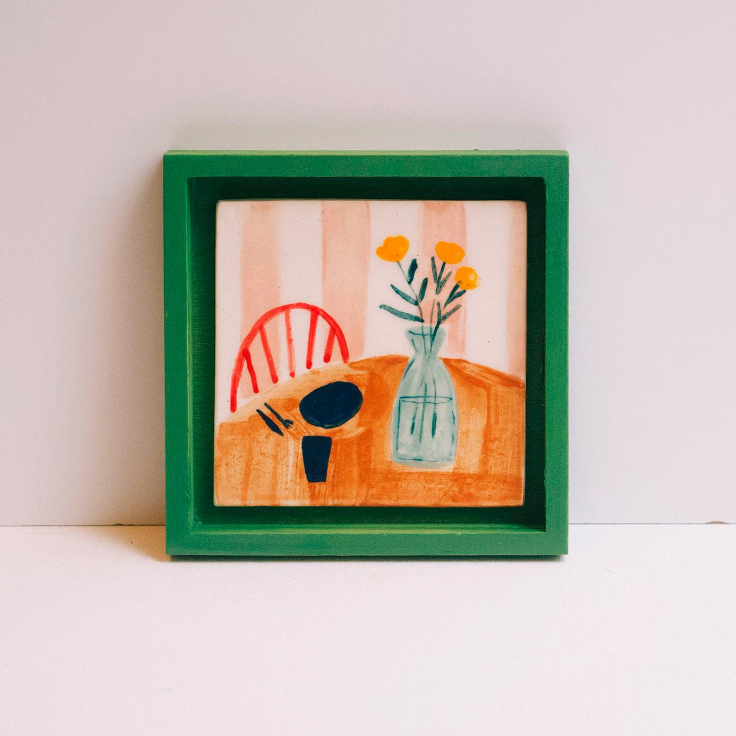 Handcrafted and hand painted glazed ceramic with wooden frame