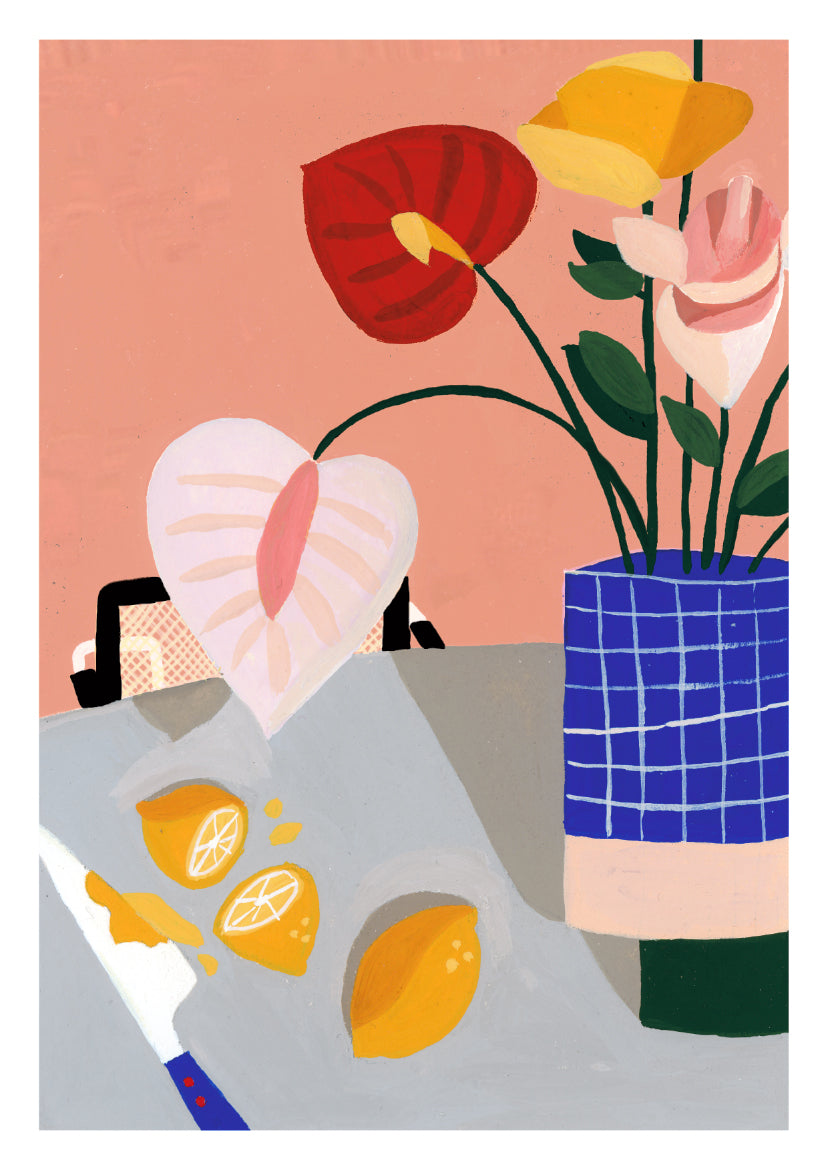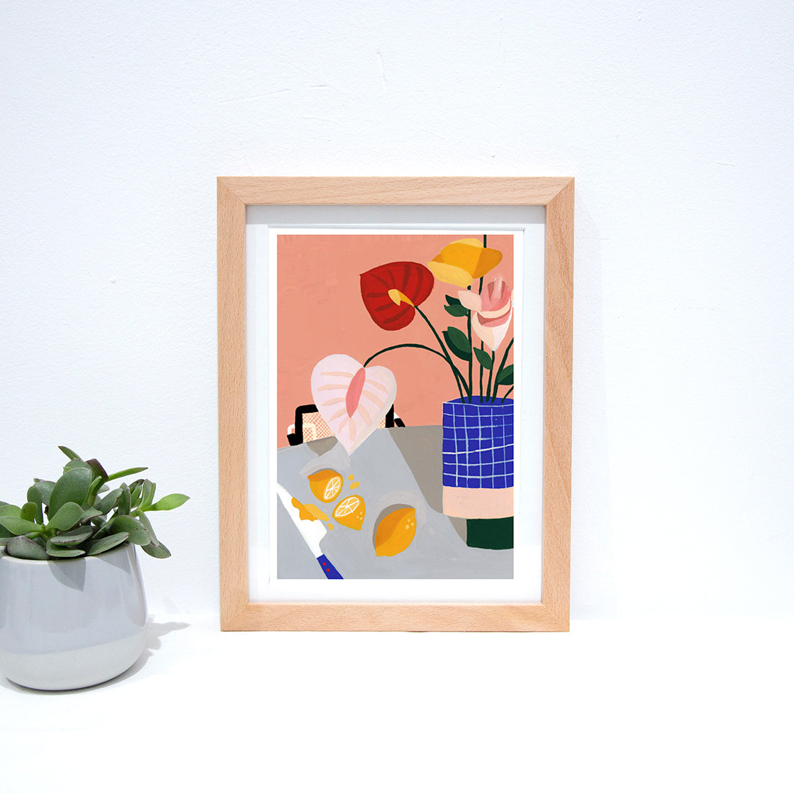 The A5 format is framed on a 24 x 18 cm frame (9,5 x 7,1 in) and also has a custom-made white mat.